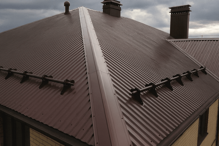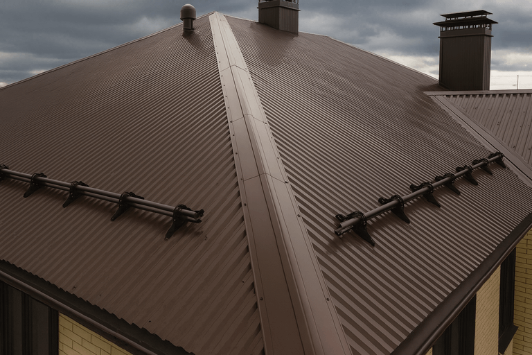 Установка крыши из профнастила выполняется сертифицированной бригадой: соблюдаем технологию крепежей, шаг обрешётки и вентиляционные зазоры — сдаём работу в срок.